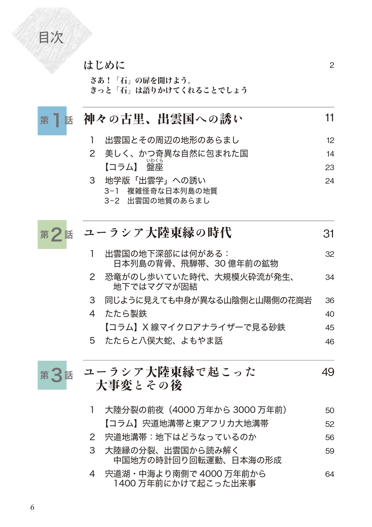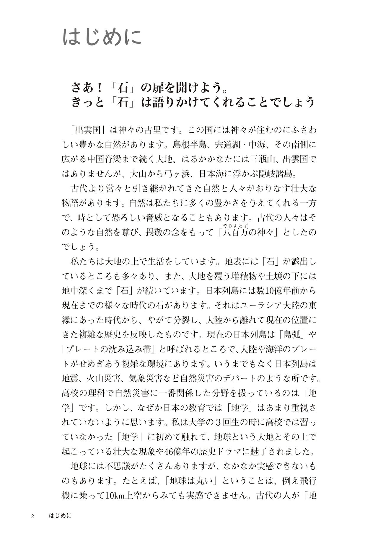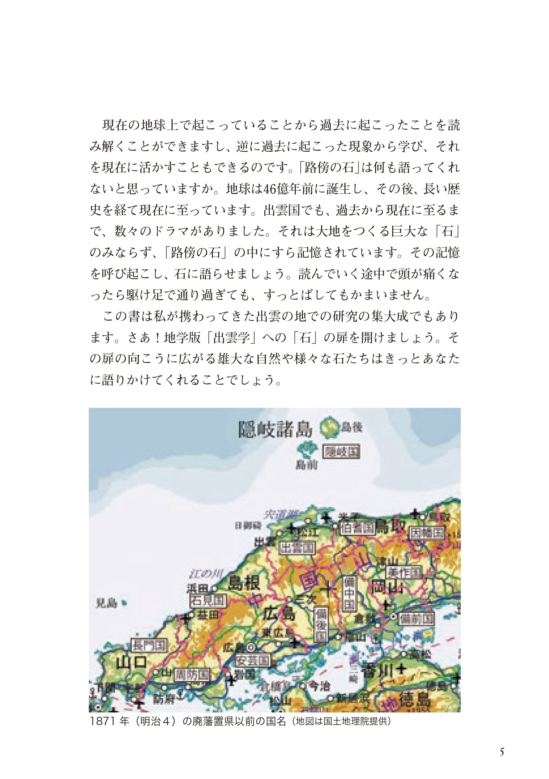 出雲国を含めた日本や、大陸の分裂がリアルタイムで起こっている東アフリカ大地溝帯を中心に研究をしてきた著者が、一般読者向けに難解な「地質学」をエピソードを紹介しながら紐解いていく。地質学への入門書。